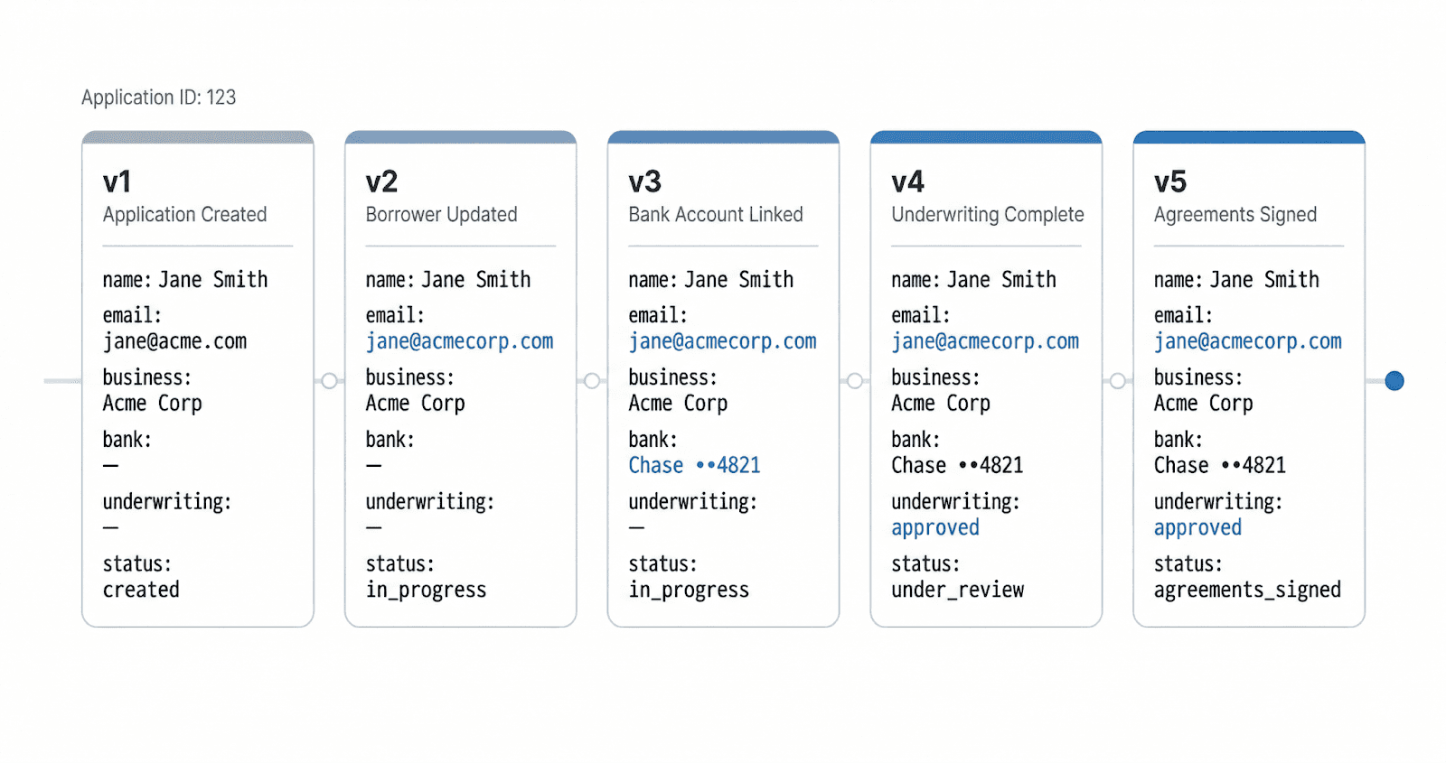 Mutation made things worse. When a borrower record was updated, the previous values were gone. Knowing what had changed, and at what point in the workflow, required auditing infrastructure that had to be added separately and maintained independently. Without it, reconstructing how an application had evolved meant inference, not inspection.