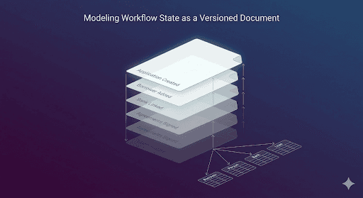 The solution was to stop treating the application as a set of mutable rows and start treating it as an append-only record. In the redesigned system, the application document is never modified in place. Instead, each change produces a new version of the entire document, stored with an incrementing version number associated with the application ID. Each version is immutable. The most recent version represents the current state of the application, and every previous version remains intact.