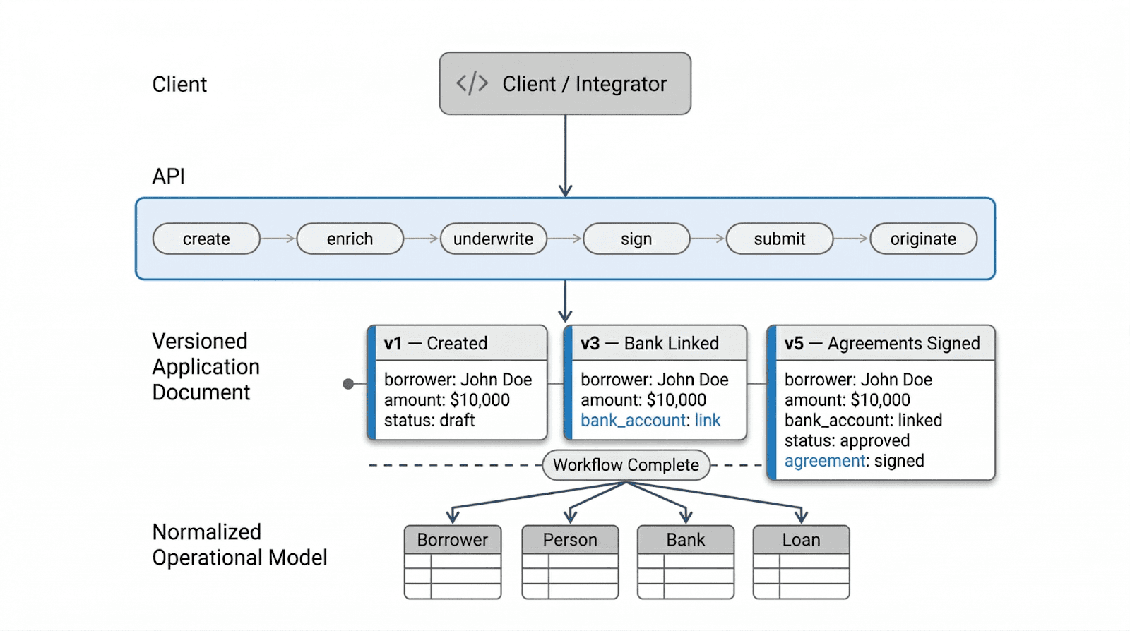 The sections above describe each phase of the workflow in isolation. The diagram below shows how they connect end to end, from the client integrating with the API through to the normalized operational model that downstream systems depend on.