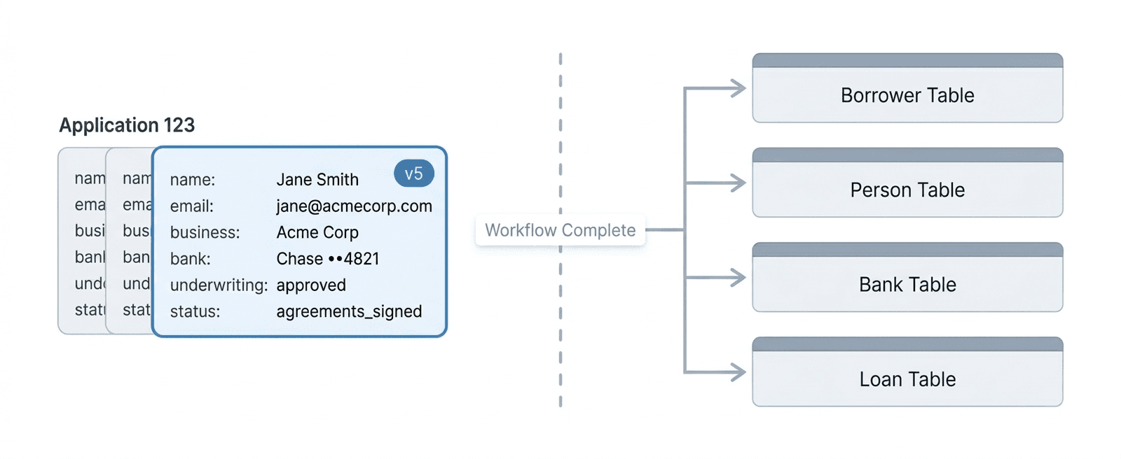 So once an application reaches completion, the final version of the document is decomposed into its component parts and written into the normalized relational tables used by the rest of the platform. Borrowers, persons, bank accounts, loan terms, and other entities each move into their respective tables, where they can be queried and used in the ways those systems expect.