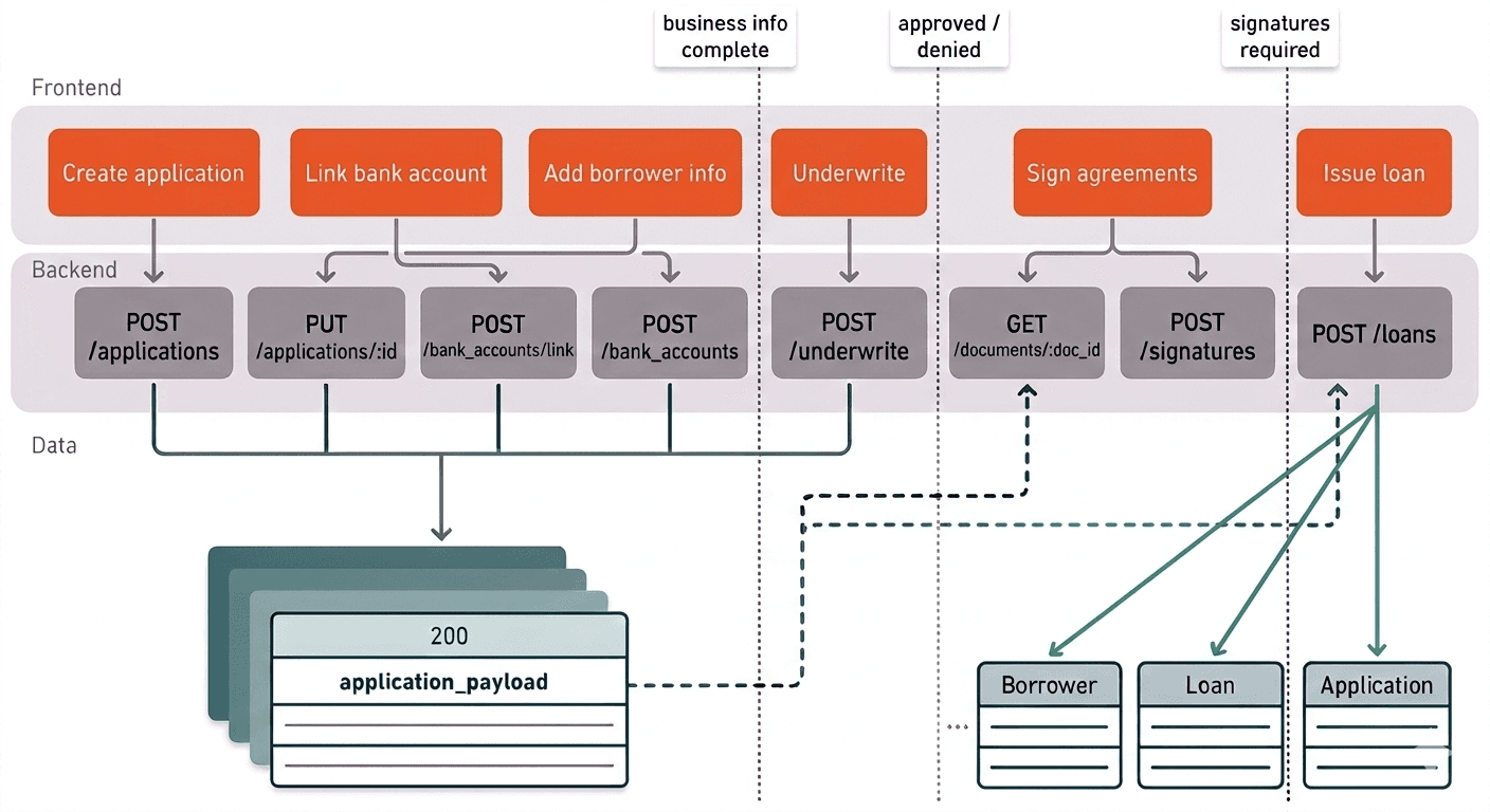 The API was designed around the data model. That meant the data model's constraints became the developer's constraints. To start a loan application, you first had to create a borrower. To add an owner to the business, you had to create a person and attach them to the borrower. To connect a bank account, you created a bank account record and associated it with the application. Each step reflected a foreign key relationship in the database, not a step in a lending workflow.