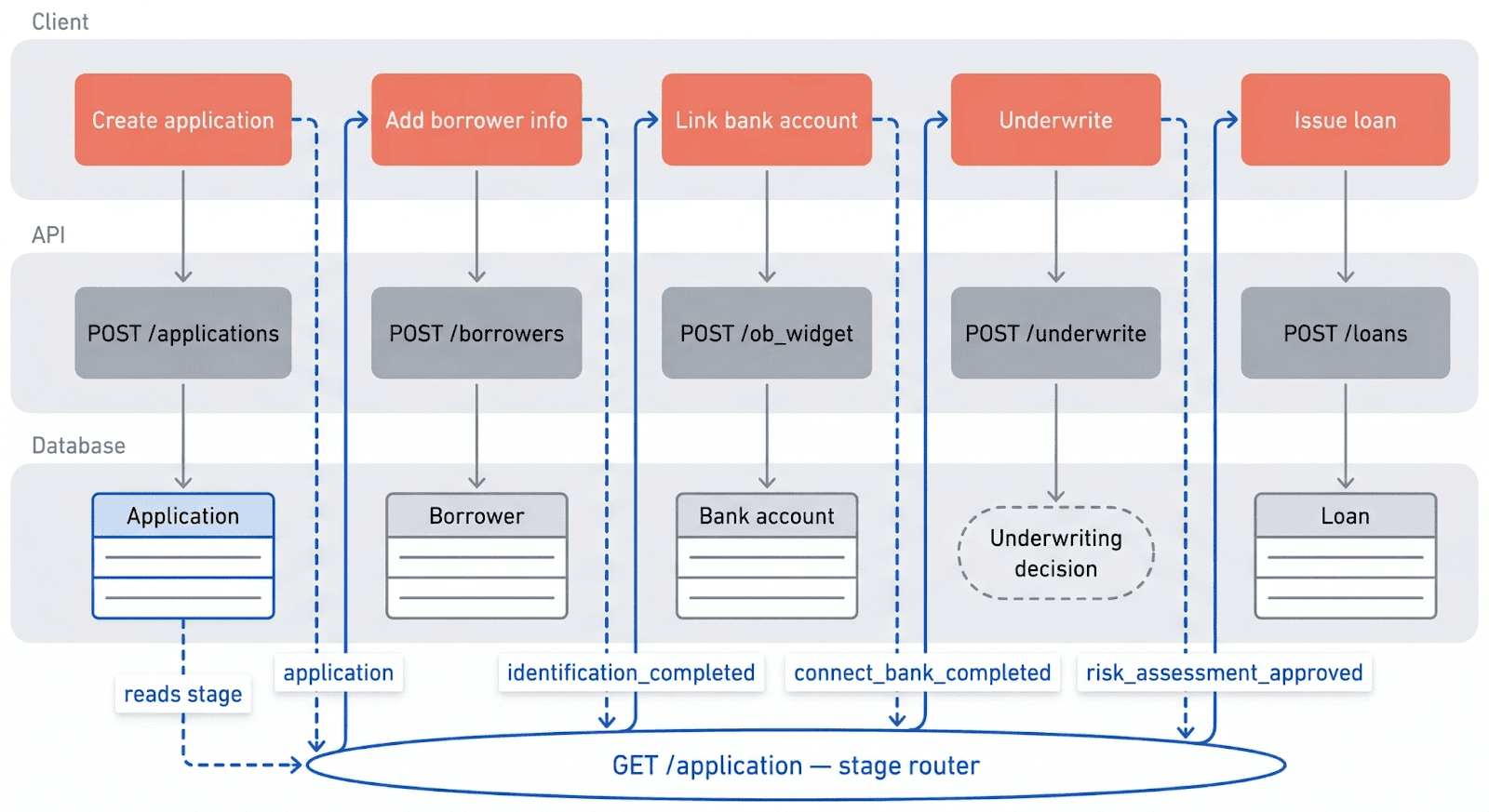 To understand why, it helps to look at what the original API actually imposed on developers. Before an application could be submitted for underwriting, a client had to create a borrower record, create person records and attach them to the borrower, create the application with the borrower attached, connect a bank account as a separate entity, and then advance the application through a sequence of explicit stage transitions, each guarded by the platform.