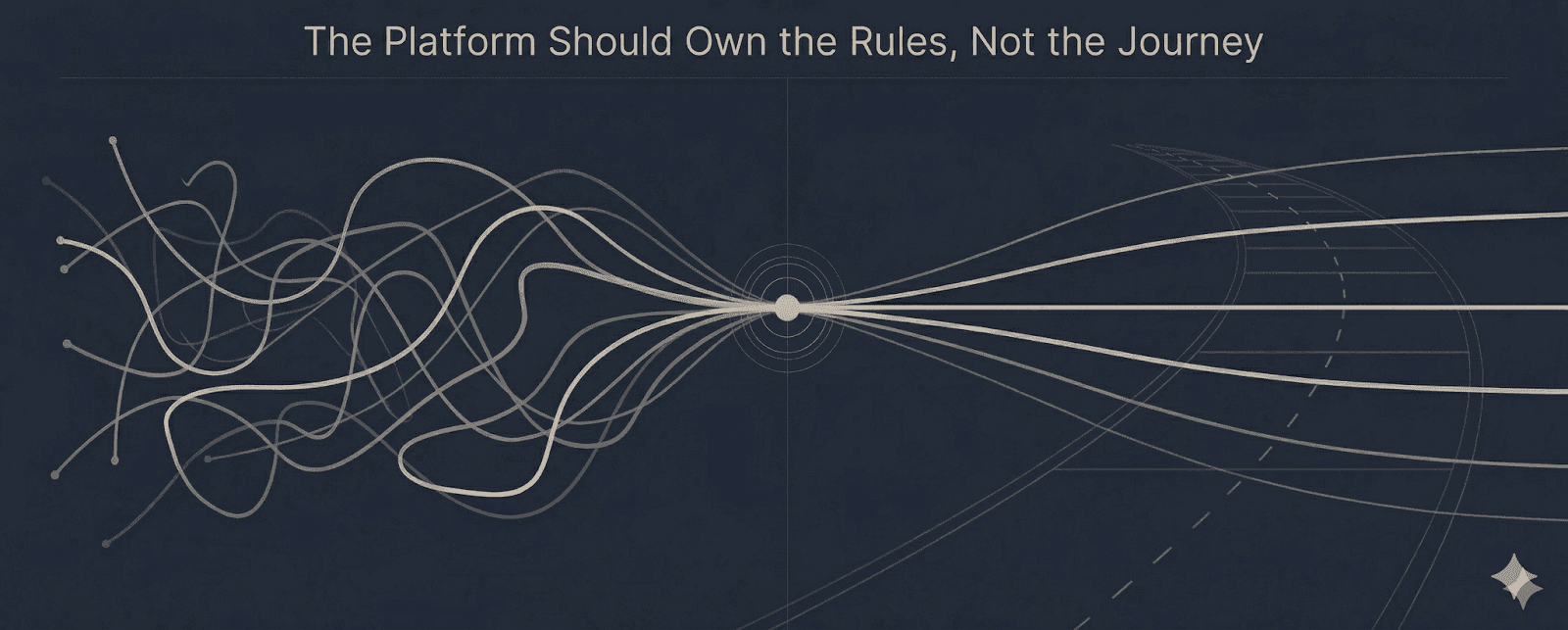 The distinction is straightforward but important. The platform should enforce the rules that must be true and stay out of the order in which they are experienced.