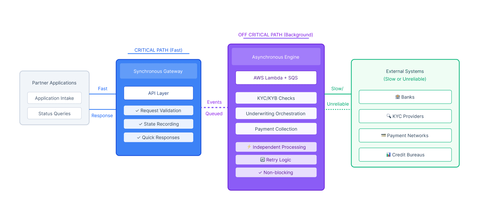 This separation keeps partner interactions responsive while allowing lending workflows to progress reliably in the background.
